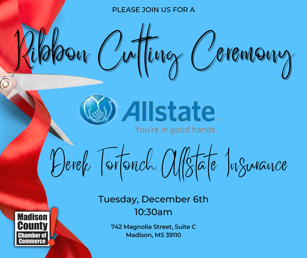 Join us Tuesday, December 6th at 10:30am for a Ribbon Cutting event to celebrate Derek Tortorich: Allstate Insurance They are located at 742 Magnolia Street Suite C in Madison. Derek is committed to helping Madison residents assess their immediate and long-term needs and choose options that will help them achieve their goals. Hope to see you there!